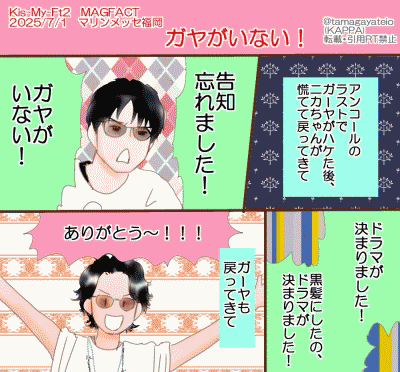いつもの女性、男性、ちびっこに声を出させて。 2:「ミヤの自己紹介でアサデス。ってのが福岡に来たなって」 M:「ちょっと眠いよね?」 2:「あ、鯛茶漬けありがとうございます」 この日、ホントに暑くて、Glory daysを宮っちが間違えて、その後千ちゃんもつられて間違ってしまったので。 M:「千ちゃん、ごめんな」 S:「時を戻したい、歌詞を覚えてたあの頃に」 M:「歌詞にリンクしてんな〜」 Y:「2人は特に塩分水分とってください」 M:「はい、今日はハケた瞬間に口にポカリ突っ込まれた」 よこーさんが一日店長で福岡に来た時、鯛茶漬けのお店でコースを食べた話題が。 他のメンバーはお店でコースは食べたこと無いそう。 今朝アサデスで宮っちがこだマンに会ったら「よこーさんってホント素敵な人だよね、腰低くてさ」って誉めてたという話をしたら…。 F:「え?」 Y:「誰だ?」 F:「腰が低いって言われたの、コース料理食べた後なの?」 M:「前だったら!」 Y:「そう見られてたのか?太輔くんは。気をつけろよ」 F:「怖!こだマンに見してあげたい」 って、やっぱガーヤ、おもろい。 F:「ということで、大爆笑のエピソードを!!!」 Y:「ごめんなさい…」ガーヤには誰もかなわない…。 そっから告知に。 キスマイTikTokの撮影はあっという間に終わるとか、宮っちが秋葉の野郎ラーメン行った話に。 2:「俺、最初、ミヤの物真似してる人がいる。この人、こんなガチな感じでミヤの物真似して、it's Alrightやってるって思ったら、本物だった」って、ニカちゃんも天然? M:「どんだけ一緒にいてさ」 玉森くんが「ラボンのCMは新しいのが流れるかな?流れないかな? 楽しみですね。 しかし、玉森くんが「マニョ」って言う声が可愛すぎるvv T:「7/10にグランメゾン東京のSPドラマのブルーレイ&DVDが出ると、さっき聞きました」さっき聞いたんだw 2:「8/14〜16ニカゲームのイベントやります」 宮っちの告知は相変わらず沢山あり過ぎる。 でも、宮っちが「♪アデランス〜宮田です」をネタにしてやってるのでww ●「メロディ」 ●MC 2:「いい歌だ…。次、行くか…」 宮っちがニカちゃんのことを「たけし」って言って、よこーさんがたけしさんの物真似やったvv F:「ワタと長く絡むの怖い」 Y       FS2 告知の続きで。ガーヤがA-Studio+とAimetoiの話をしましたが、 ニカちゃんがガーヤの古着の番組を観たって言う話をして。 千ちゃんは7/7からレプリカが始まるって話で主題歌が「CHEAT」って話を。 2:「CHEATが主題歌って、相当クセがあるよ」 クリムト・アライブの様子はレポ3のおまけに書きました。 よこーさんが沖縄旅の宣伝を。 ニカちゃんが「七五三掛君の記事出てた」って補足を。 その流れで。 Y:「うどん食べました」 F:「資さんうどん」わたたい、福岡の資さんうどん行ったんだvv F:「24時間やってますんで。やってますんでってちょっと行っただけでお前が何言ってるんだよって」 F:「おはぎみたいなのね。美味しかった。お勧めです。おはぎね。お前が何言ってるんだよ」って、一人突っ込みしてるガーヤがおかしいけど、資さんうどんのごぼ天うどんとおはぎ、私も以前大阪で食べたけど、美味しかったなvv で、次の曲へ 2:「この2人のパフォーマンスはしんどいね!!」ってニカちゃん上手いvv  |
