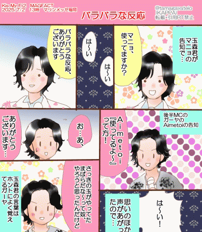 ●MC S:「ペンライトの時、向かいあってると逆になるけど、みんな全く釣られてないよね」 M:「あれ、ちゃんと覚えないと居残りさせられるからね」って、何気に居残りさせたのガーヤだよねvvv M:「じゃ、そんな千ちゃんが乾杯の発声もらってもいいですか?」 S:「準備できましたか?みんなでいくよ、せ〜の、乾杯」 M:「今日、何度?」 ファン:「35!」 M:「気象予報士見てたらキレるわ」 M:「昨日より環境は涼しくなってるんだよね」 たった1日で改善するスタッフさん。ホント凄い。 確かに昨日よりは涼しかった, しかし、やっぱマリンメッセの立見、楽だわ! ずっと手すりに捕まっていられるから、もしかしたら、普通の席よりも楽かも。あんま足疲れてない。 で、暑いとヲタクがウチワで扇ぐから。 F:「ウチワって便利だよね」 S:「暑いと自分にも扇げるし」 2:「本来そういうもんだよ」 Y:「エコでいいよね」 F:「家で急にちらし寿司ってなった時、ウチワねえわ、ああ、もうこれでいいわ」って言ってたけど…、ウチワ使う用事で真っ先にちらし寿司が出てくるところがガーヤっぽくて可愛い。 2:「なにこれ?投げキスしてって入ってるんだけど」(すぐガーヤに乗っかるニカちゃん) よこーさんがそこで「俺が俊哉」っての持ってた男性がいたって言ってて。(結局この男性、全員分のやつ持ってたそうで…なんだかなあ…) M:「この場においては俺が本物の俊哉だぞ」って言った宮っちカッコいいv M:「声、貰っていい?俊哉?」って叫ばせてた。 いつもの女性、男性、ちびっこの声を貰って。 M:「男性の方が多くない?」 2:「女性が気ぃ抜いたんちゃうか?」 もう一回やらせるも、 F:「半々だ」 ちびっこに宮っちが「大きくなってもキスマイのライブに来るんだぞ」 Y:「それまで頑張るからね」って、ホントに頑張ってほしい。 でも、一回彼氏が出来て隠す女子の真似をするガーヤがvv M:「何?キスマイ好きなの?」 F:「『別に。たまたま。中学の時、好きだったの。』 『だよな、こんなの捨てるよな』 2:「いつでもキスマイはいるよな」 Y:「52…」 Y:「玉ニカが本番30分前にダンベル?」 2:「チューブでやったことなくて。めっちゃスパルタなの!」 2:「それ、廊下でやってて、俺結構恥ずかしかったんだけど、先生熱いから。やめないの」 で、告知。 玉森君が「私はラボン。もう10年くらいやらせてもらってるんですけど、引き続きよろしくお願いします。あとはマニョ。 ニカちゃんはニカゲームのイベントの話と、7/8のさんま御殿の話を。 2:「ドラマ出ます!詳細は何も言えない」 で、宮っちは「アサデス。」の話や、「アデランス〜宮田です」を・ 2:「笑いが起きるね」 そのほかにも色々な告知が。 ●メロディ ●MC T:「お色直しでもしますか?」 籠を持って行った時に籠からニカメロンが落ちた! 誰かが「♪ニカメロン〜Oh〜」ってデカメロン伝説歌ったんだけど…。よこーさんかな? 2:「ニカメロンはアゴが出てるから、しょうがないな…」 Y       2SF